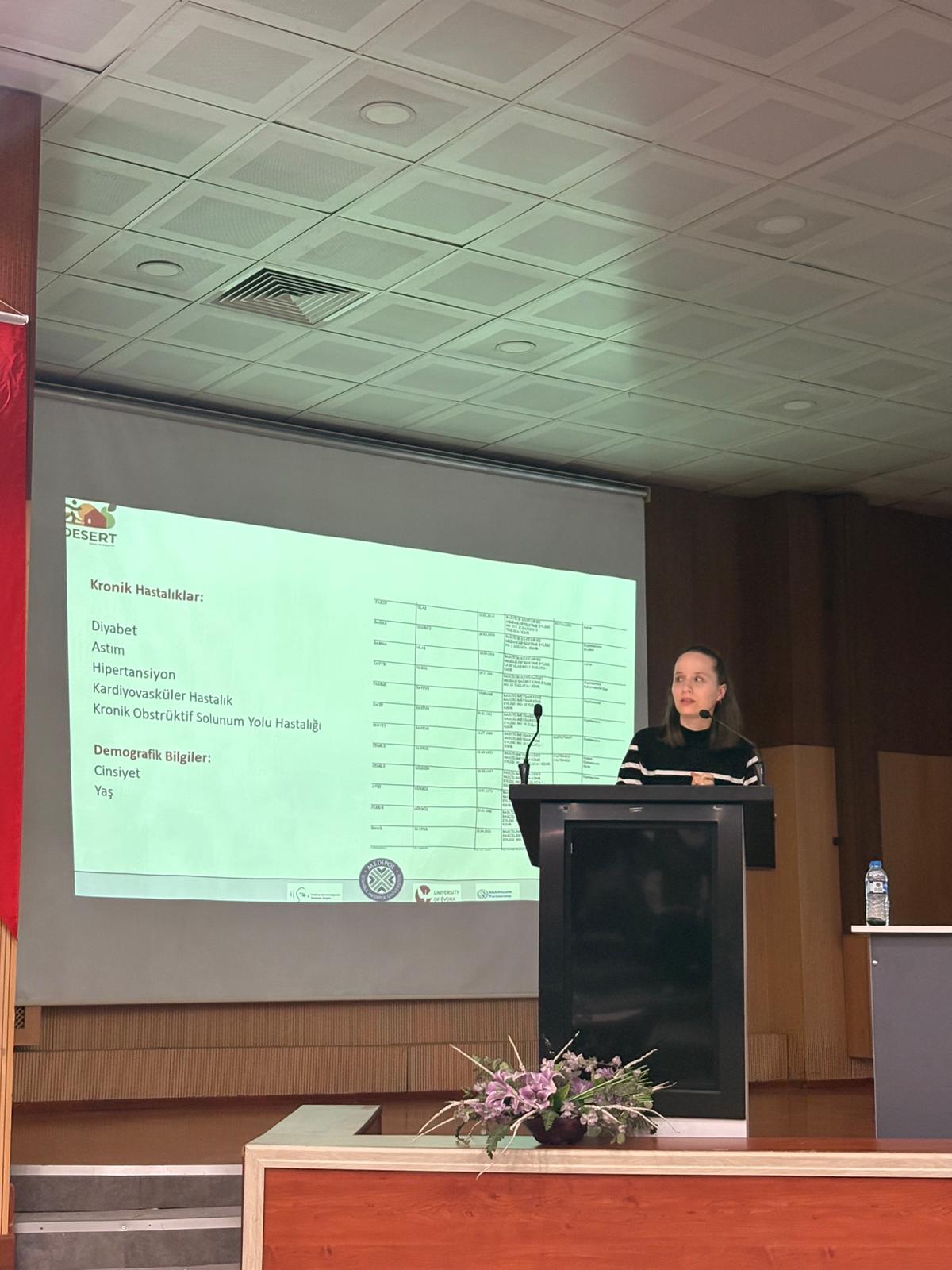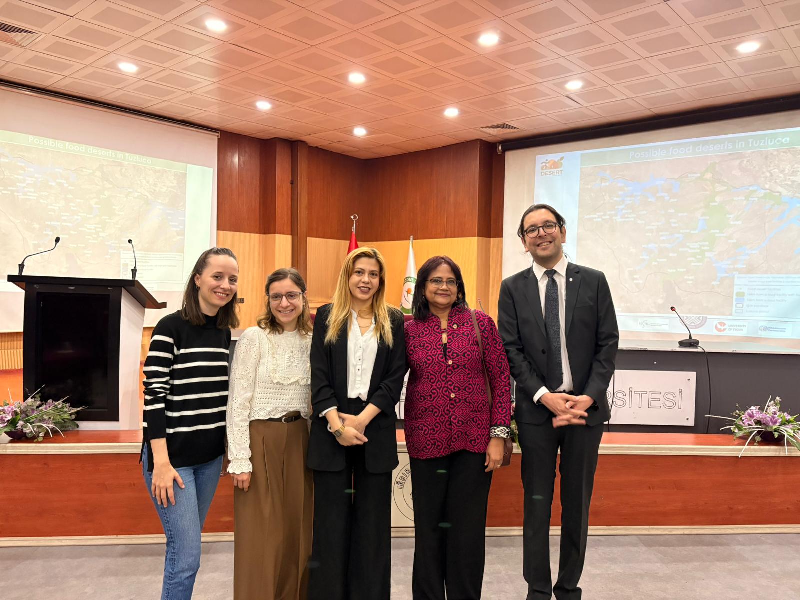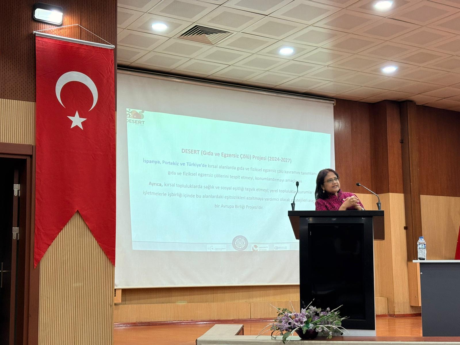 AB ve Tübitak desteğiyle Portekiz, İspanya ve Türkiye'den üniversitelerin ortaklığıyla gerçekleştirilen DESERT (Diet and Exercise Strategies for Equity in Rural Territories) projesi kapsamında araştırma faaliyetleri için Iğdır'da olan Doç. Dr. Indrani KALKAN ve Dr. Öğr. Üyesi Merve PEHLİVAN tarafından fakültemizde "Türkiye'de Besin Çölü Araştırmaları" konulu konferans gerçekleştirildi.